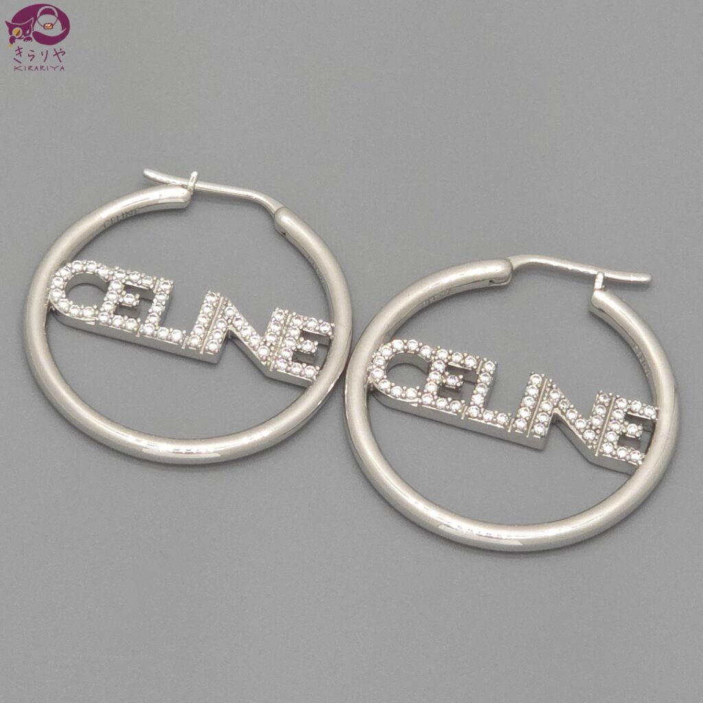 CELINE セリーヌ モノクローム ストラス フープ ピアス 両耳 CELINEロゴ ストラス/クリスタル ロジウムフィニッシュ ブラス 12.09g 箱 保存袋 冊子 封筒 STT3273 入荷しました。